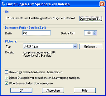 ![]() | Klicken Sie auf Scannen. Hierdurch wird das Dialogfeld Einstellungen zum Speichern von Dateien eingeblendet. |