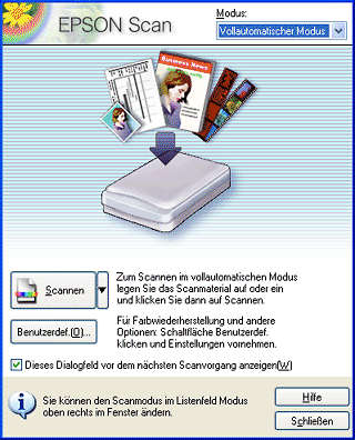EPSON Scan verfügt über drei Modi zum Vornehmen von Scaneinstellungen: vollautomatischer Modus, Standard Modus und professioneller Modus. In diesem Abschnitt wird beschrieben, wie Sie ein Bild im vollautomatischen Modus scannen. Im vollautomatischen Modus können Sie Bilder scannen, wobei die Einstellungen automatisch vorgenommen werden. Weitere Einzelheiten finden Sie unter Wählen Sie einen passenden Scan-Modus aus.
