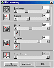 Die Gammasteuerung ermöglicht Ihnen die Einstellung der Mitteltöne in einem Bild. Sie können einen Wert von 50 (am dunkelsten) bis zu 500 (am hellsten) durch Bewegen des Schiebereglers wählen.
