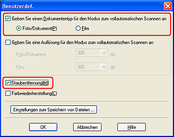 Vollautomatischer Modus: Klicken Sie auf die Schaltfläche Benutzerdef., aktivieren Sie das Kontrollkästchen Vorlagenart für vollautomatischen Modus angeben und wählen Sie bei Bedarf die Vorlagenart. Aktivieren Sie das Kontrollkästchen Staubentfernung und klicken Sie auf OK. Fahren Sie mit Schritt 9 fort.