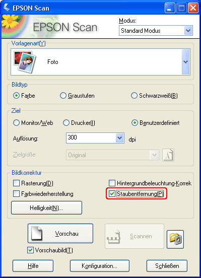 Befolgen Sie diese Schritte, um Staubflecken mit Epson Scan zu entfernen.