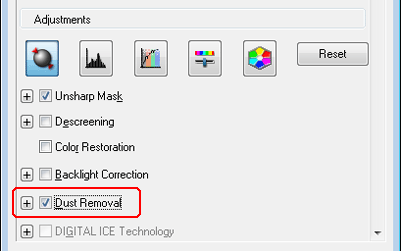 Entfernen von Staubspuren mit der StaubentfernungsfunktionMit der Funktion Dust Removal (Staubentfernung) in Epson Scan können Sie Ihre Originale beim Scannen virtuell von Staub „reinigen“.