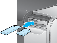 Schalten Sie den Drucker ein, öffnen Sie die Abdeckung des Speicherkartenlaufwerksund setzen Sie dann eine Speicherkarte ein, wie in der Abbildung dargestellt.