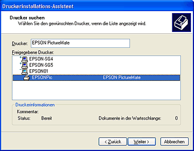 Klicken Sie auf OK. Der Name des freigegebenen Druckers erscheint in der Anschlussliste der Auswahl.