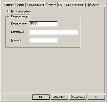 Wählen Sie das Kontrollkästchen Drucker als Netzwerkdrucker freigeben aus und geben Sie dann entsprechend den Druckernamen und das Kennwort ein.