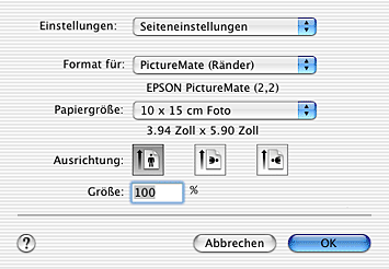 In diesem Dialogfeld können Sie die Einstellungen Format für, Papierformat, Ausrichtung und Größe zum Drucken vornehmen.