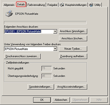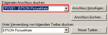 Wenn EPUSBX: (EPSON PictureMate) in der Liste Anschluss für die Druckausgabe angezeigt wird, sind der USB-Druckertreiber und die Druckersoftware richtig installiert. Wenn der korrekte Anschluss nicht angezeigt wird, fahren Sie mit dem nächsten Schritt fort.