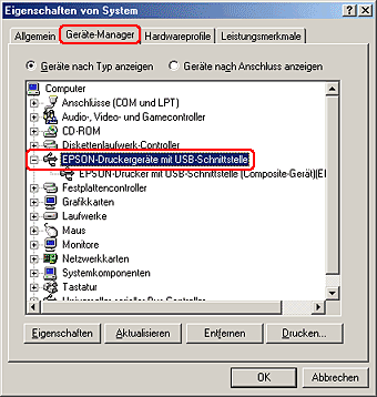 Wenn die Treiber richtig installiert sind, erscheint die Option EPSON USB-Drucker im Menü Geräte-Manager.