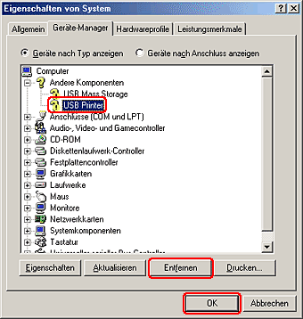Klicken Sie unter Sonstige Geräte auf USB-Drucker oder EPSON PictureMate und klicken Sie dann auf Entfernen. Klicken Sie dann auf OK.
