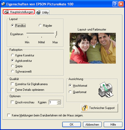 Im Men Haupteinstellungen knnen Sie Einstellungen fr Layout, Farboption, Qualitt, Optionen und Ausrichtung vornehmen. Lesen Sie dazu die folgenden Abschnitte.