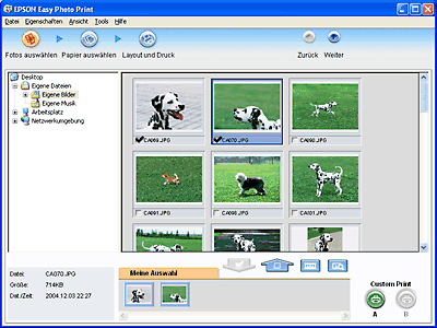 Doppelklicken Sie auf das Symbol EPSON File Manager auf dem Desktop, wählen Sie die gewünschten Bilder aus und klicken Sie dann auf das Symbol Easy Photo Print im oberen Bereich des Fensters von EPSON File Manager.
