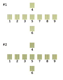Suchen Sie in den Justage-Mustern der einzelnen Sätze den Block, der am gleichmäßigsten gedruckt ist und keine wahrnehmbaren Streifen oder Linien enthält.