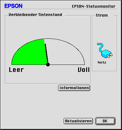 Auf der grafischen Anzeige wird die verbliebene Tintenmenge zum Zeitpunkt des Öffnens des EPSON StatusMonitors angezeigt. Um die Tintenstandinformationen zu aktualisieren, klicken Sie auf Aktualisieren.