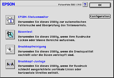 Überwacht den Status des Druckers. Wenn der EPSON-StatusMonitor einen Druckerfehler feststellt, informiert er Sie mit Hilfe einer Fehlermeldung. Sie können dieses Utility auch verwenden, um die verbleibende Tintenfüllmenge vor dem Druck festzustellen.