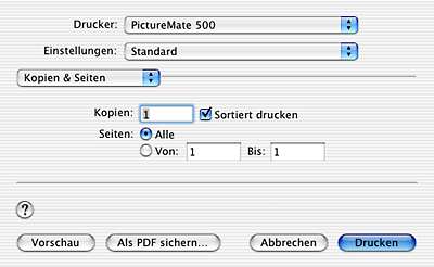 In diesem Dialogfeld können Sie die Einstellungen Exemplare und Seiten zum Drucken vornehmen.