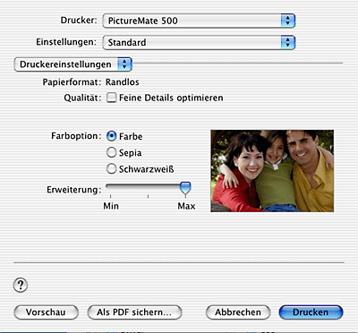 Wenn Randlos ausgewählt ist, wird der Schieberegler Erweiterung verfügbar. Mit dem Schieberegler können Sie den Betrag des Bilds einstellen, der beim randlosen Druck über die Papierkanten ragt.