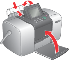 Drücken Sie die Oberseite der Papierstütze nach unten und schließen Sie sie gegen den PictureMate. Schließen Sie dann das Ausgabefach.