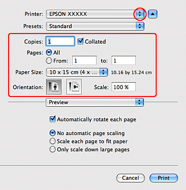 Wählen Sie in Printer (Drucker) den verwendeten Drucker. Stellen Sie dann Copies & Pages (Kopien & Seiten) ein.