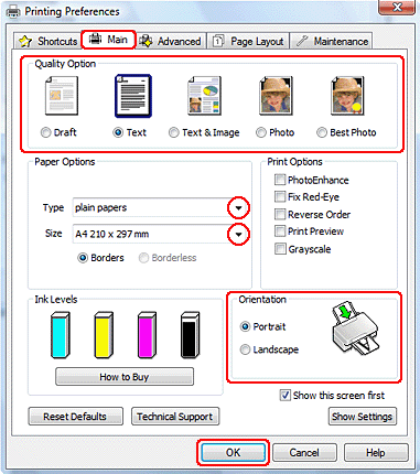 Wählen Sie den verwendeten Drucker unter Printer (Drucker) aus, und nehmen Sie anschließend geeignete Einstellungen vor.