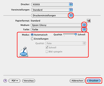 Nehmen Sie die erforderlichen Einstellungen für Medium, Farbe und Modus vor. Weitere Informationen zu den Druckereinstellungen finden Sie in der Online-Hilfe.