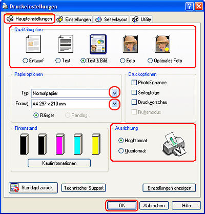 Wählen Sie die geeigneten Einstellungen für Papiergröße und Ausrichtung aus. Sie können auch ein eigenes Papierformat definieren. Nähere Informationen finden Sie in der Online-Hilfe.