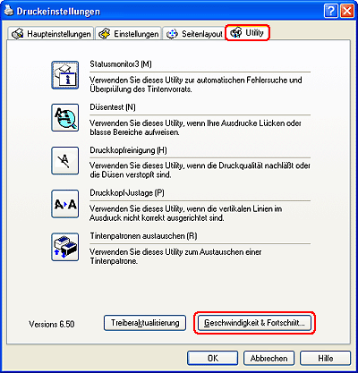 Die Druckgeschwindigkeit können Sie durch Auswählen bestimmter Einstellungen im Fenster Geschwindigkeit & Fortschritt erhöhen. Klicken Sie auf die Schaltfläche Geschwindigkeit & Fortschritt im Fenster Wartung des Druckertreibers.