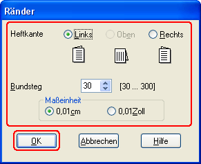 Wählen Sie cm oder Zoll als Einstellung für Maßeinheit aus. Legen Sie die Breite des Bindungsrands fest.