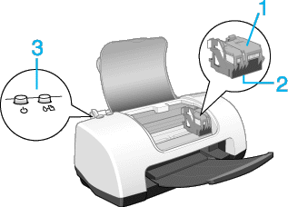 1. Arretierbügel der Tintenpatronen: Hält die Tintenpatronen an ihrem Platz. Öffnen Sie die Arretierbügel nur, wenn Sie Tintenpatronen einbauen oder austauschen.