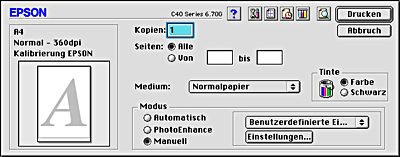 Wenn Sie eine Ihrer benutzerdefinierten Einstellungen aus der Liste gewählt haben und die Einstellung für Medium oder Farbe ändern, springt die in der Liste angezeigte Markierung zurück auf Benutzerdefinierte Einstellungen\xc9 . Die Änderung hat keine Auswirkung auf die zuvor gewählte Benutzereinstellung. Um zu Ihrer benutzerdefinierten Einstellung zurückzukehren, klicken Sie sie einfach noch einmal in der Liste an.