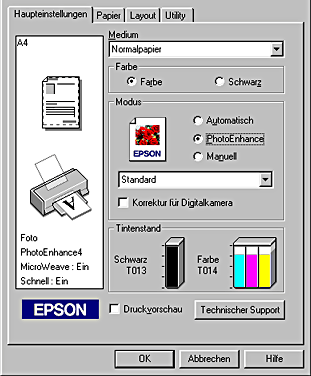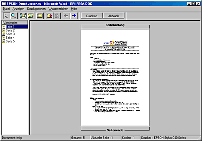 Wenn Sie einen Druckauftrag an den Drucker abschicken, wird das Fenster Druckvorschau Ihres EPSON-Druckers geöffnet, und Sie können vor dem Druck noch Änderungen vornehmen.