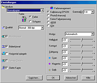 Wenn der Modus Automatisch in der Registerkarte Haupteinstellungen gewählt ist, werden alle weiteren Einstellungen auf der Basis der aktuellen Einstellungen für Medium und Farbe von der Druckersoftware vorgenommen. Nähere Anweisungen zur Einstellung der Farbe finden Sie unter Die Farbe einstellen. Nähere Anweisungen zur Einstellung des Druckmediums finden Sie unter Die Druckmedienart einstellen.