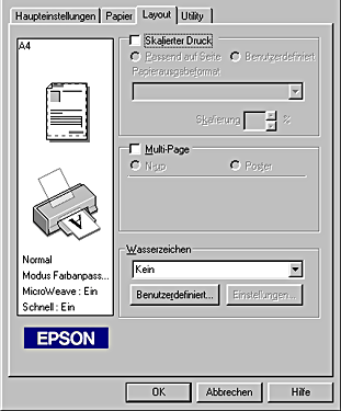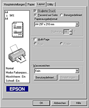 Auf der Registerkarte Layout können Sie die Einstellungen Skalierter Druck, Multi-Page und Wasserzeichen vornehmen. Näheres finden Sie jeweils im entsprechenden Abschnitt weiter unten.