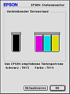 Sie können dieses Utility ferner verwenden, um den Tintenstand vor dem Drucken zu überprüfen. Wenn der EPSON-Statusmonitor geöffnet ist, zeigt er den Status der verbleibenden Tintenmenge zum Zeitpunkt des Öffnens an. Um die Tintenstandinformationen zu aktualisieren, klicken Sie auf die Schaltfläche Aktualisieren.