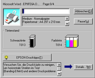 In einem Textfeld unten im Dialogfeld des Fortschrittsbalkens werden Tipps ausgegeben, wie Sie die EPSON-Druckersoftware optimal einsetzen können. Alle 30 Sekunden erscheint ein neuer Tipp. Wenn Sie mehr Informationen zum angezeigten Tipp wünschen, klicken Sie auf die Schaltfläche Details.