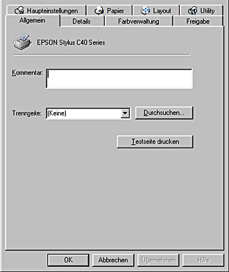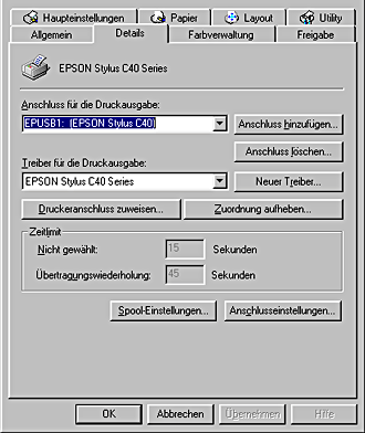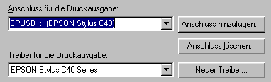 Wenn EPUSBx: (EPSON Stylus C40-Reihe oder EPSON Stylus C20-Reihe) im Listenfeld An folgendem Anschluss drucken angezeigt wird, sind der USB-Druckertreiber und die Druckersoftware korrekt installiert. Wenn der korrekte Anschluss nicht angezeigt wird, fahren Sie mit dem nächsten Schritt fort.
