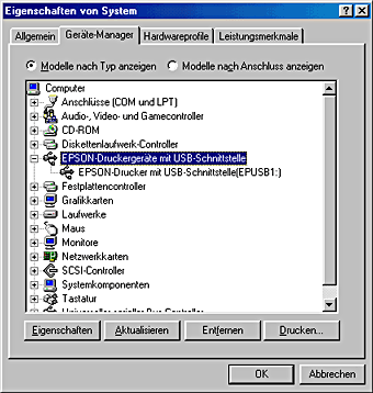 Wenn die Treiber korrekt installiert sind, erscheint die Option EPSON USB-Drucker im Menü Geräte-Manager.