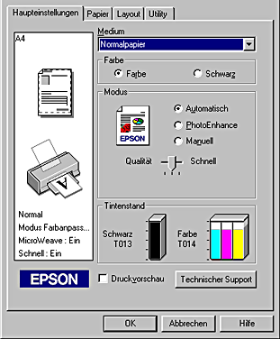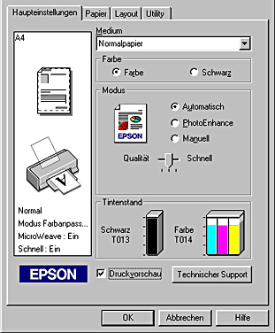 Wenn Sie einen Druckauftrag an den Drucker abschicken, wird das Fenster Druckvorschau Ihres EPSON-Druckers geöffnet, und Sie können vor dem Druck noch Änderungen vornehmen.