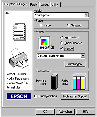 Wenn der Modus Automatisch in der Registerkarte Haupteinstellungen gewählt ist, werden alle weiteren Einstellungen auf der Basis der aktuellen Einstellungen für Medium und Farbe von der Druckersoftware vorgenommen. Nähere Anweisungen zur Einstellung der Farbe finden Sie unter Die Farbe einstellen. Nähere Anweisungen zur Einstellung des Druckmediums finden Sie unter Die Druckmedienart einstellen.