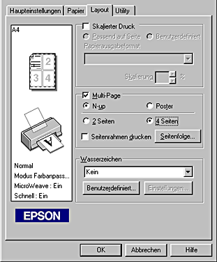 Wählen Sie N-up als Einstellung Multi-Page in der Registerkarte Layout, um zwei bzw. vier Seiten Ihres Dokuments auf ein Einzelblatt zu drucken.