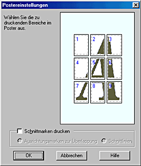 Wenn Sie nur einzelne Blätter und nicht das ganze Poster drucken möchten, klicken Sie auf die Blätter, die Sie nicht drucken möchten und anschließend auf OK, um das Dialogfeld Postereinstellungen zu schließen.