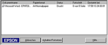 Der EPSON Spool Manager ähnelt dem Windows Druck-Manager. Gehen mehrere Druckaufträge gleichzeitig ein, werden sie aneinander gereiht (bei Netzwerkdruckern wird dies als Druck-Warteschlange bezeichnet). Erreicht ein Druckauftrag den Anfang der Warteschlange, wird er vom Spool Manager zum Drucker übertragen. Vom Spool Manager aus können Sie Statusinformationen zu den Druckaufträgen, die Sie an den Drucker abgeschickt haben, erhalten. Außerdem können Sie ausgewählte Druckaufträge löschen, anhalten und fortsetzen.