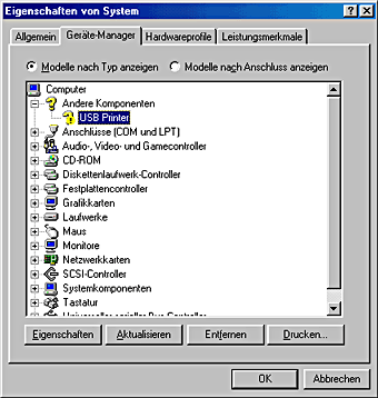 Wenn weder die Option USB-Drucker, EPSON Stylus C40 noch EPSON Stylus C20-Reihe unter Andere Komponenten erscheint, klicken Sie auf Aktualisieren oder ziehen das USB-Kabel vom Drucker ab und schließen es anschließend erneut am Drucker an. Wenn die korrekte Option angezeigt wird, fahren Sie mit Schritt 5 fort.