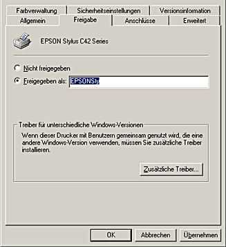 Wenn Sie wollen, dass Windows 2000 oder XT automatisch Druckertreiber in Systeme herunterlädt, die unter verschiedenen Windows-Betriebssystemen funktionieren, klicken Sie auf Zusätzliche Treiber. Wählen Sie dann die Betriebsbedingungen und das Betriebssystem für die anderen Computer aus. Klicken Sie auf OK und legen Sie dann die Druckertreiber-CD-ROM in das CD-ROM-Laufwerk ein. Wählen Sie WIN9X für Windows Me, 98 oder 95. Klicken Sie auf OK, um die zusätzlichen Treiber zu installieren.