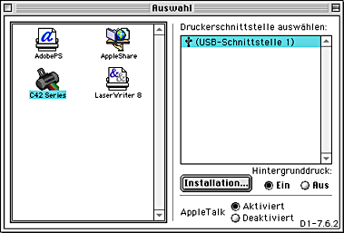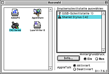 Wählen Sie im Applemenü die Option Auswahl. Klicken Sie auf das entsprechende Druckersymbol und wählen Sie den gewünschten Druckeranschluss aus der Liste Druckeranschluss auswählen.