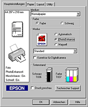 Der Modus PhotoEnhance stellt verschiedene Bildkorrektureinstellungen zur Verfügung, die Sie unmittelbar vor dem Ausdrucken von Fotos anwenden können. PhotoEnhance hat keinen Einfluss auf die Originaldaten Ihrer Bilder.