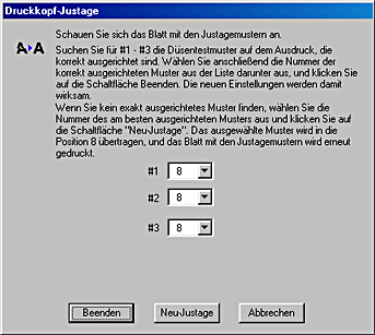Wählen Sie aus jedem Muster der Testseite die vertikale Zeile, die am besten ausgerichtet ist. Wählen Sie für jedes Muster die entsprechende Zeilennummer im jeweiligen Dropdown-Listenfeld des Dialogfensters Druckkopf-Justage und klicken Sie dann auf Beenden, um die neuen Einstellungen zu aktivieren.