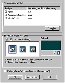 Markieren Sie das Kontrollkästchen Shortcut-Symbol, um ein Verknüpfungssymbol auf der Windows-Taskleiste zu platzieren. Wenn Sie auf das Shortcut-Symbol in der Symbolleiste klicken, öffnet sich der EPSON-Statusmonitor 3. Wenn Sie auf das Symbol mit der rechten Maustaste klicken, rufen Sie einige der Drucker-Utilitys auf. |