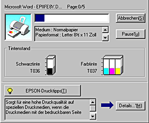 Sie können den Füllstand der Tintenpatronen entweder mit EPSON StatusMonitor 3 oder dem Fortschrittsbalken prüfen. Näheres finden Sie jeweils im entsprechenden Abschnitt weiter unten.