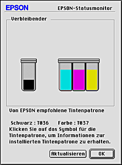 Auf der grafischen Anzeige wird die verbleibende Tintenmenge zum Zeitpunkt des Öffnens von EPSON-Statusmonitors angezeigt. Um die Tintenstandinformationen zu aktualisieren, klicken Sie auf Aktualisieren.