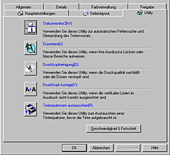 Um die Utilitys zu benutzen, klicken Sie in der Druckersoftware auf die Registerkarte Utility und anschließend auf die Schaltfläche für das Utility, das Sie benutzen möchten. Beachten Sie die nachfolgenden Abschnitt für den Zugang zur Druckersoftware.